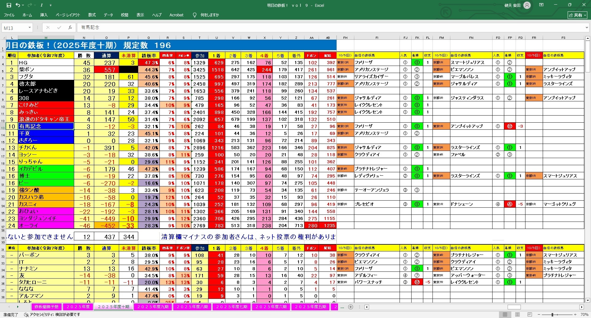 順位 参加者 勝 敗 鉄板率 四着率 ドボン率 参加 1着 2着 3着 4着 5着 着外 ドボン 配給